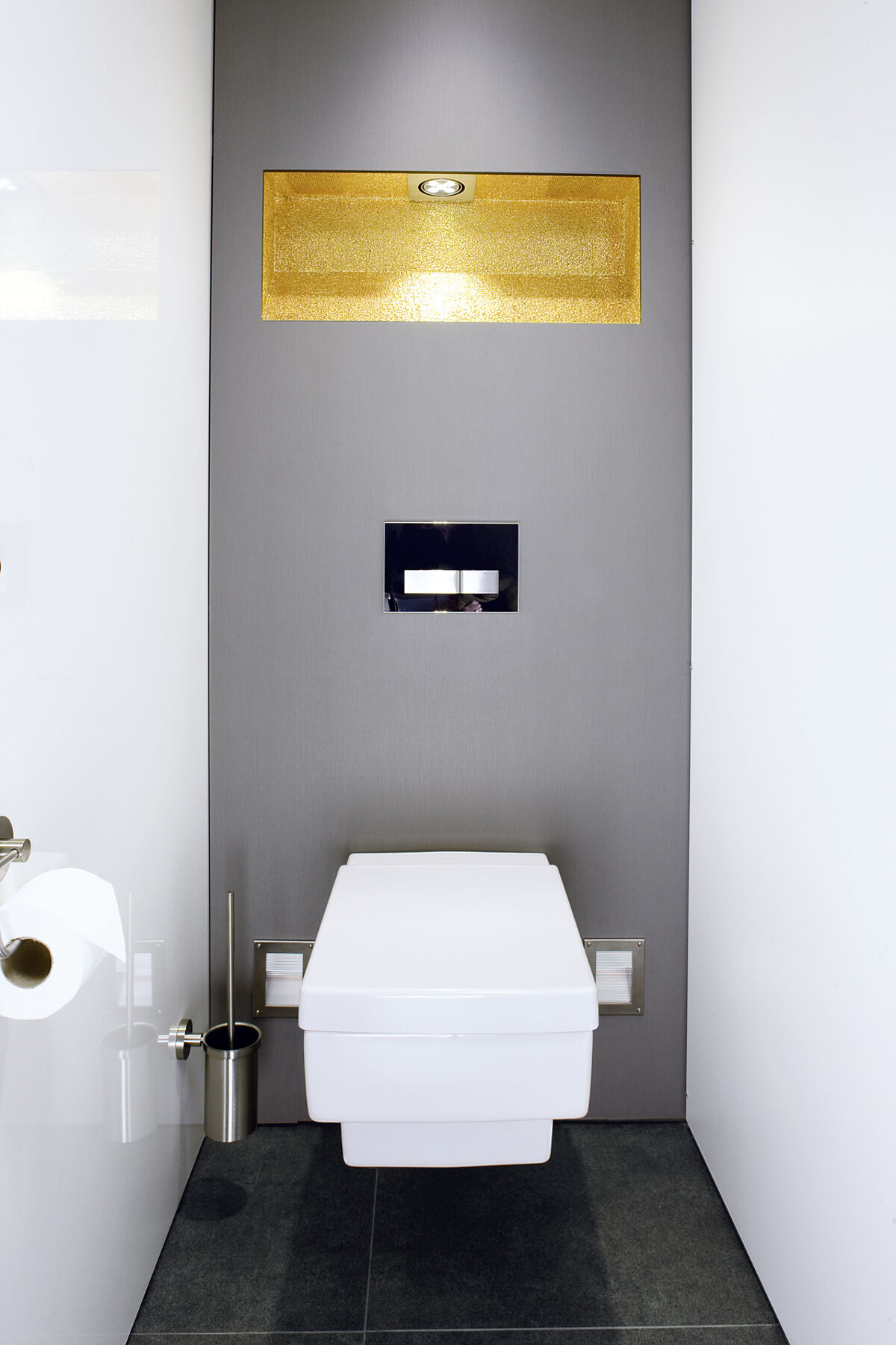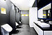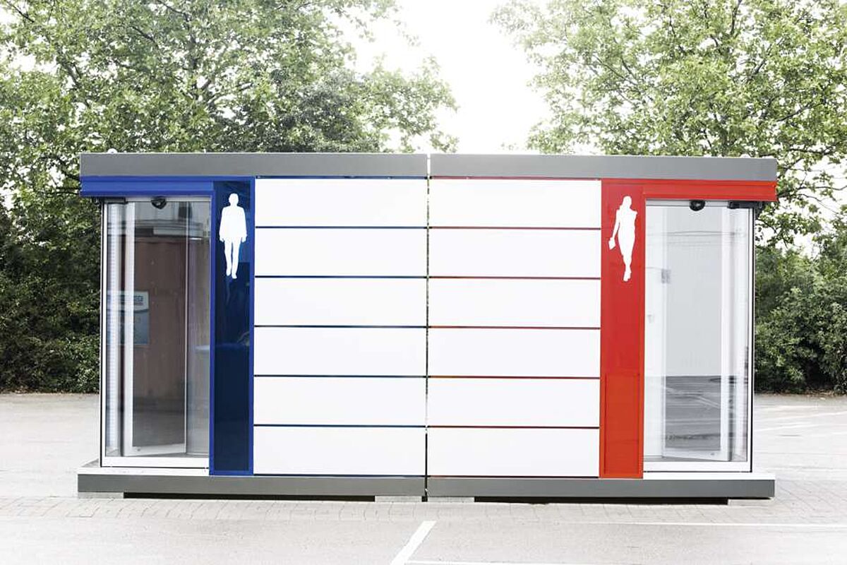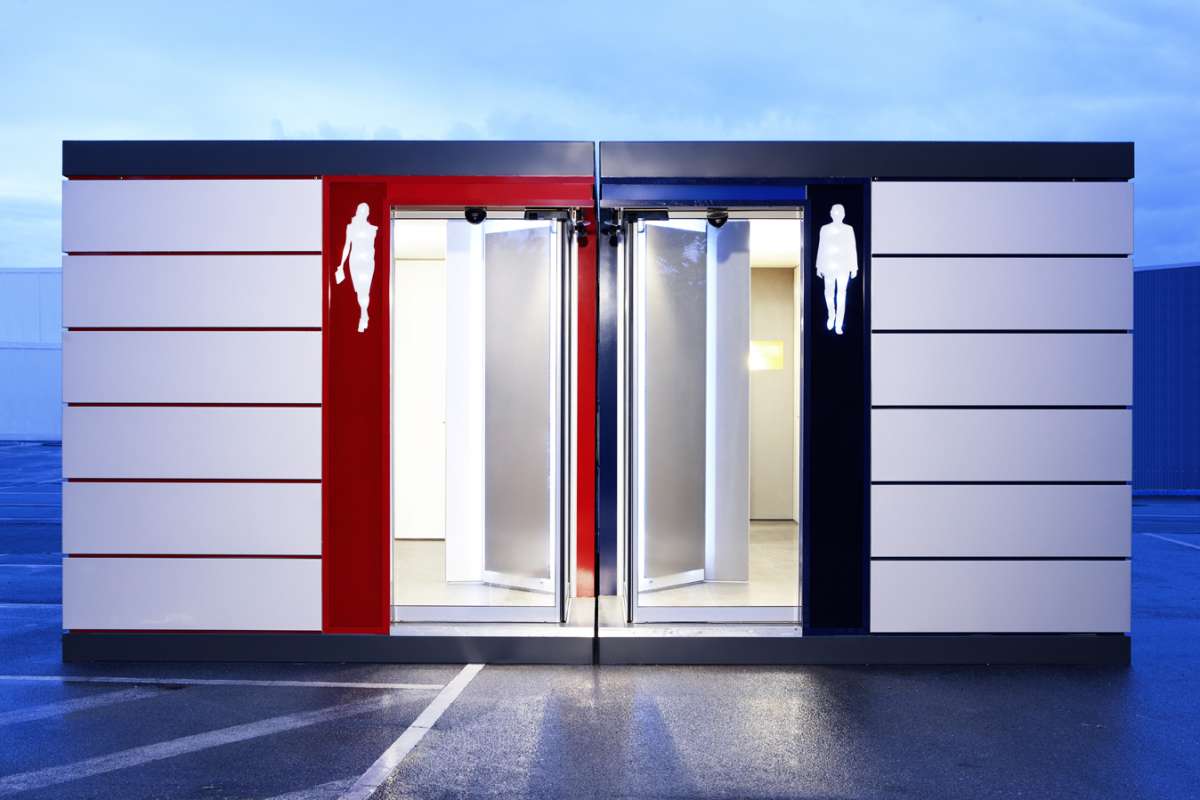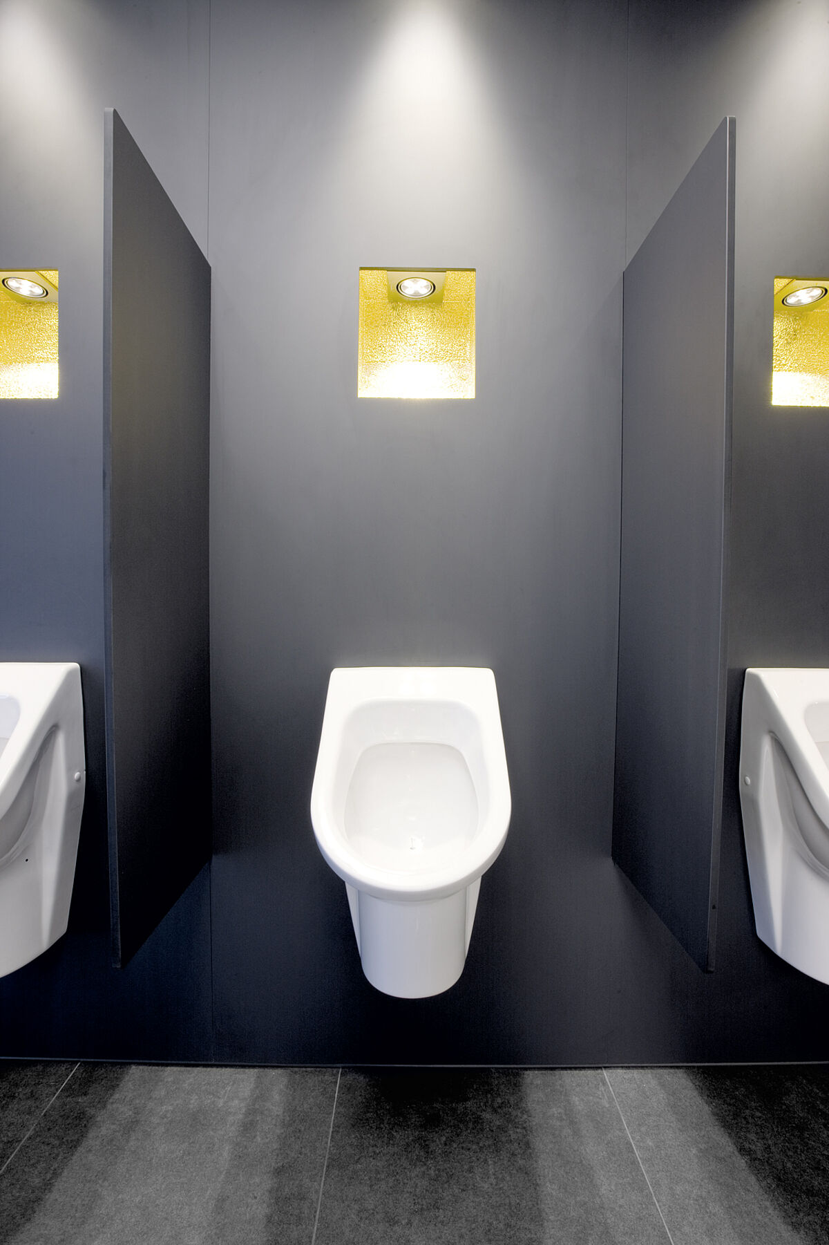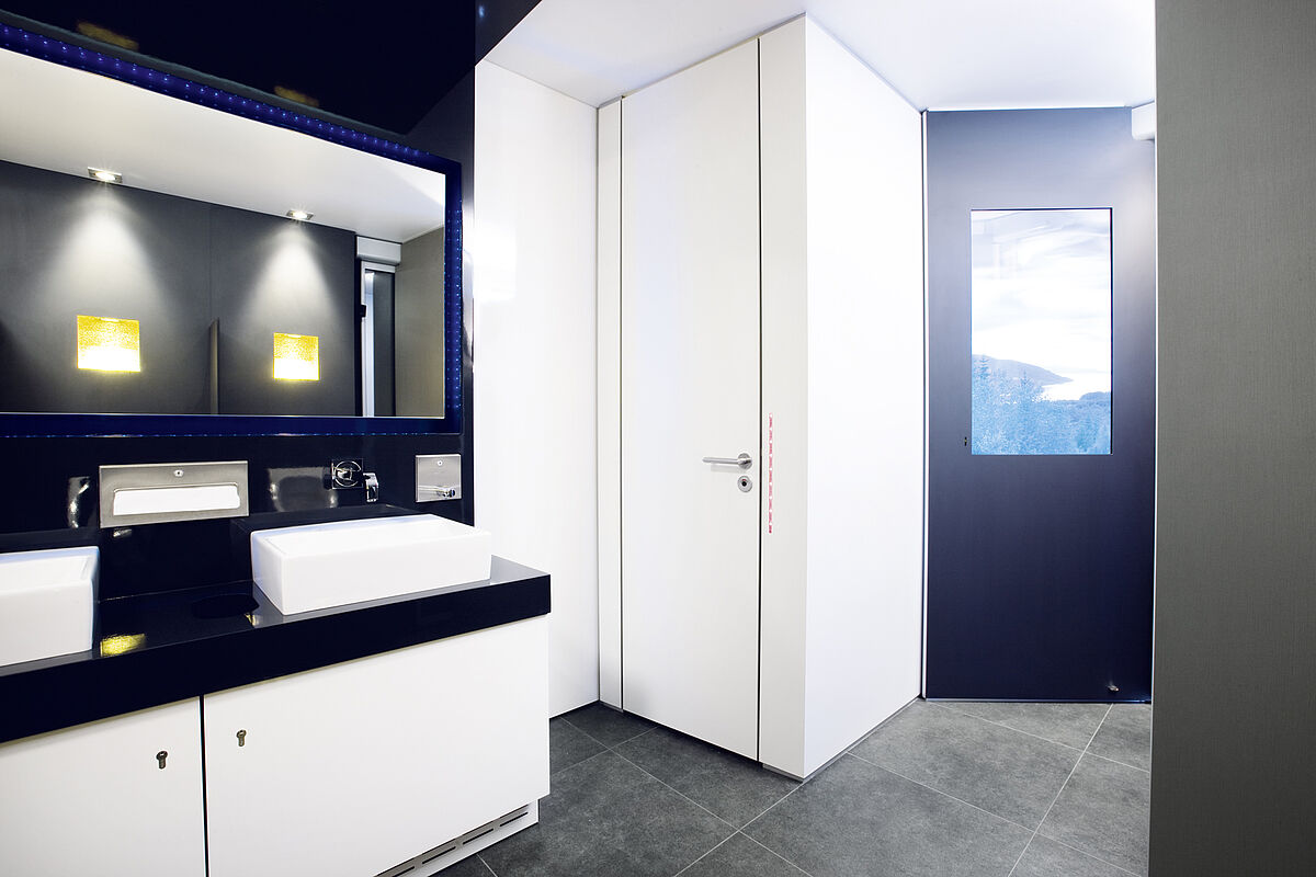 One of the special features of this spacious sanitary container is the 46-inch screen in the entrance area, on which, for example, movies with company images can be shown. Individual enclosed room-high cabins with their own air exhaust system, a vacancy/occupancy display with LED technology, accessories and touch-free urinals are further contemporary conveniences.
