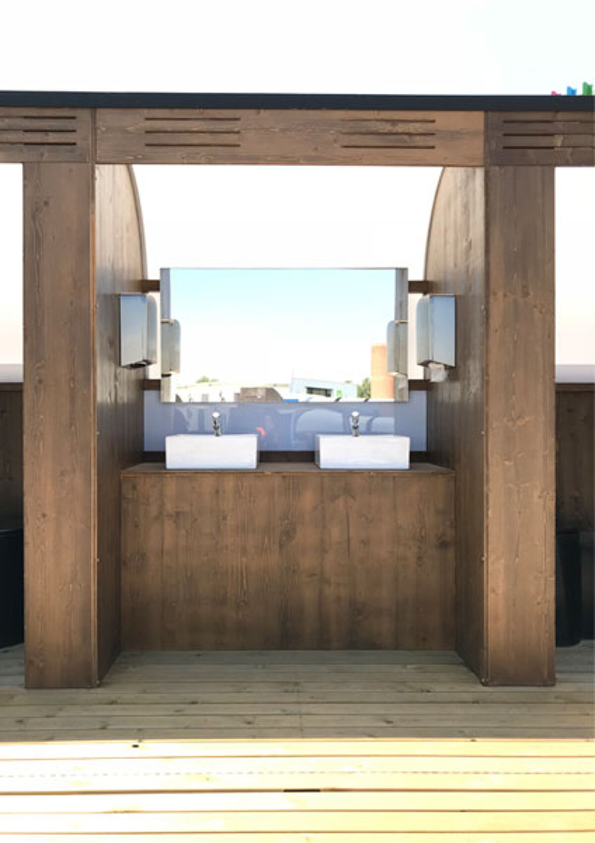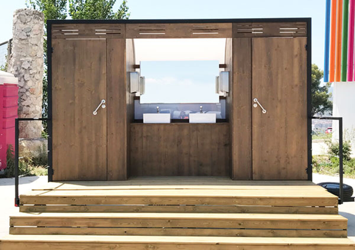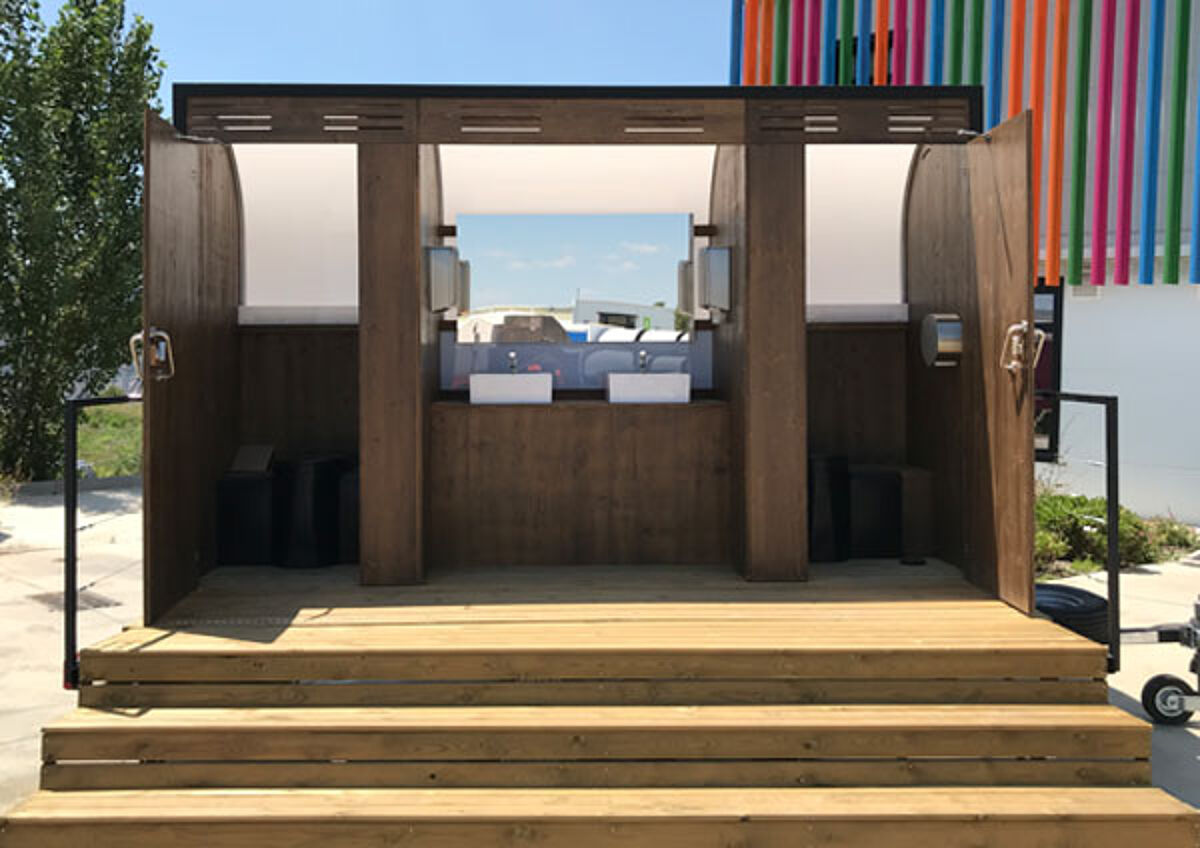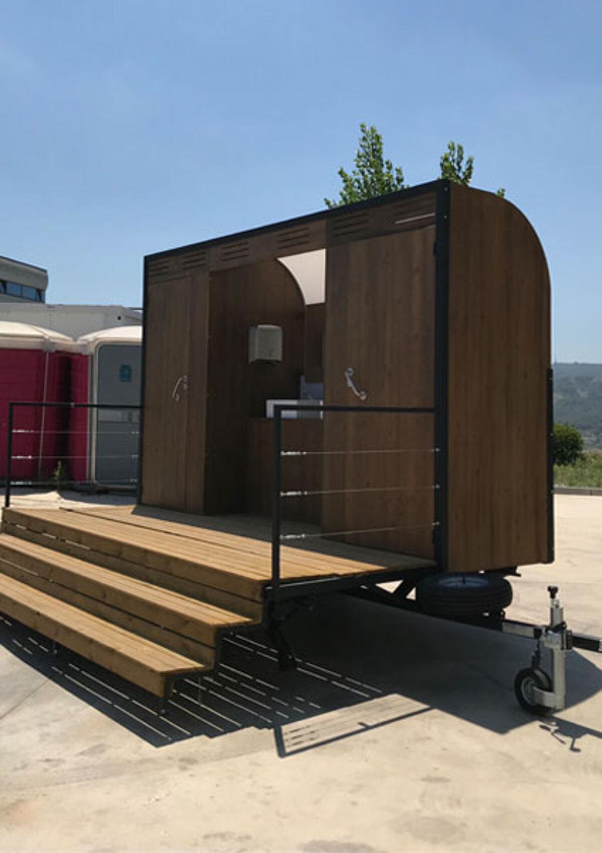 Remolque descubierto con plataforma sanitaria, dotada de 2 cabinas WC autónomas y doble lavamanos. Su moderno diseño en madera, lo dota de un carácter natural y lo singulariza estéticamente para adaptarse a todo tipo de eventos.