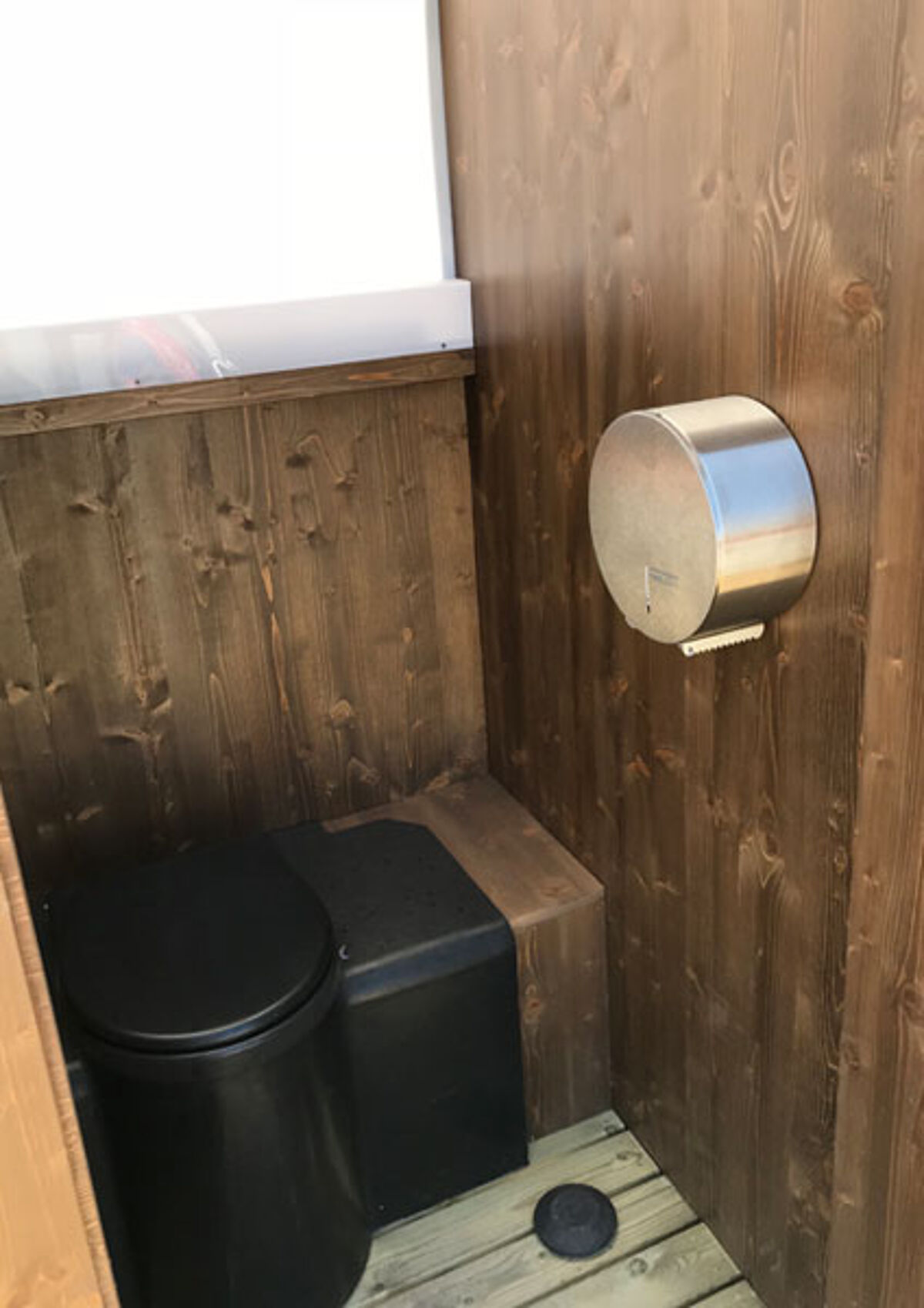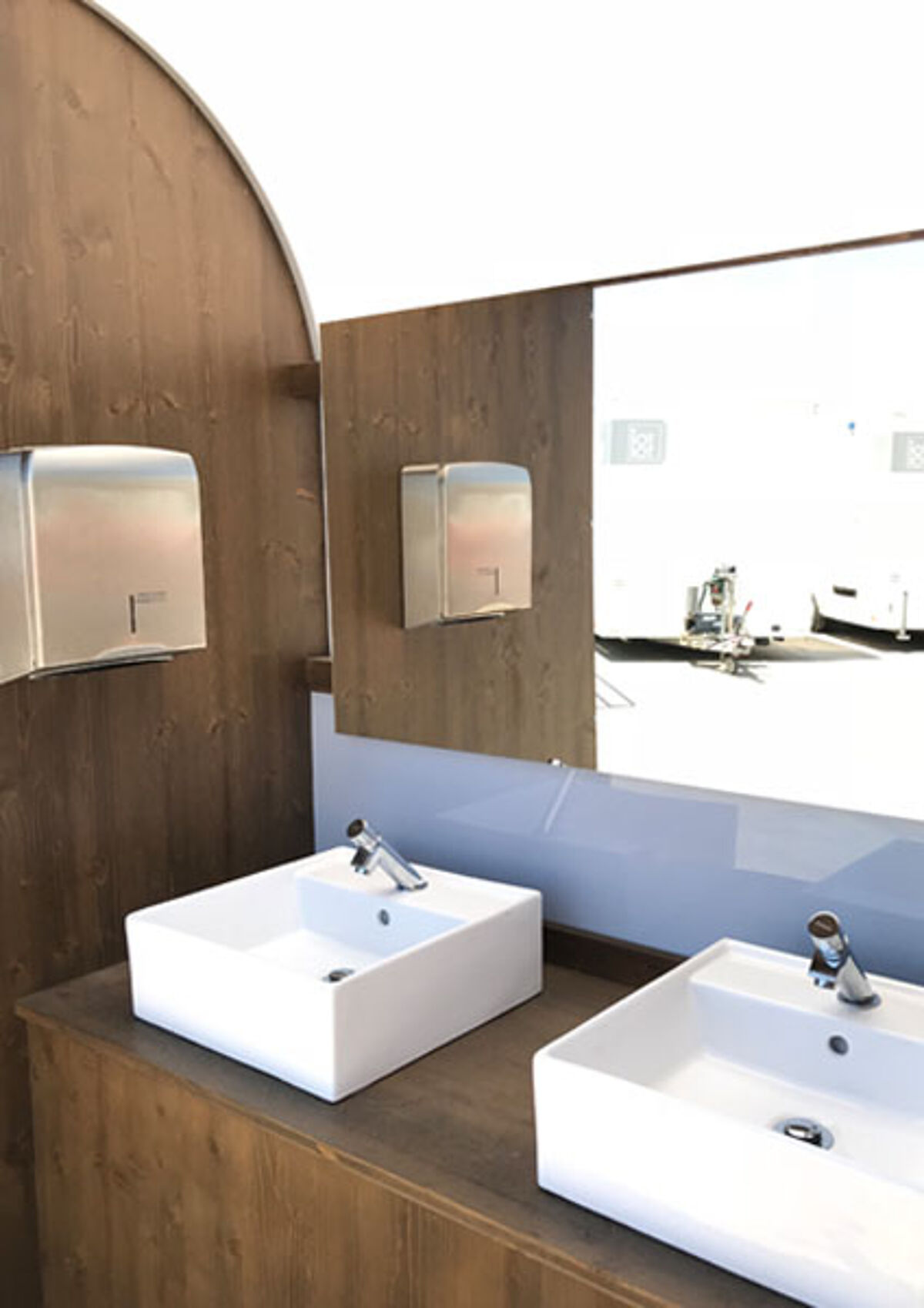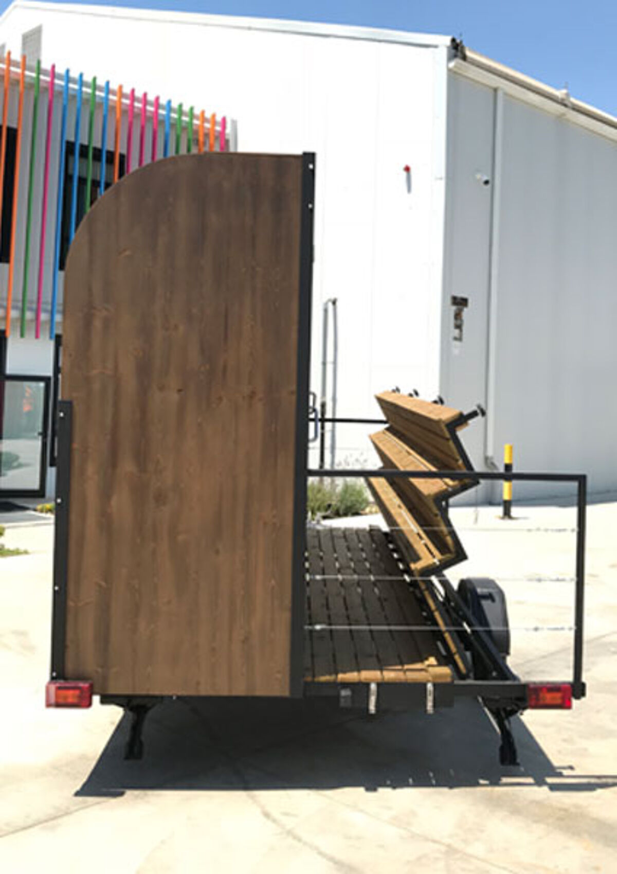 Remolque descubierto con plataforma sanitaria, dotada de 2 cabinas WC autónomas y doble lavamanos. Su moderno diseño en madera, lo dota de un carácter natural y lo singulariza estéticamente para adaptarse a todo tipo de eventos.