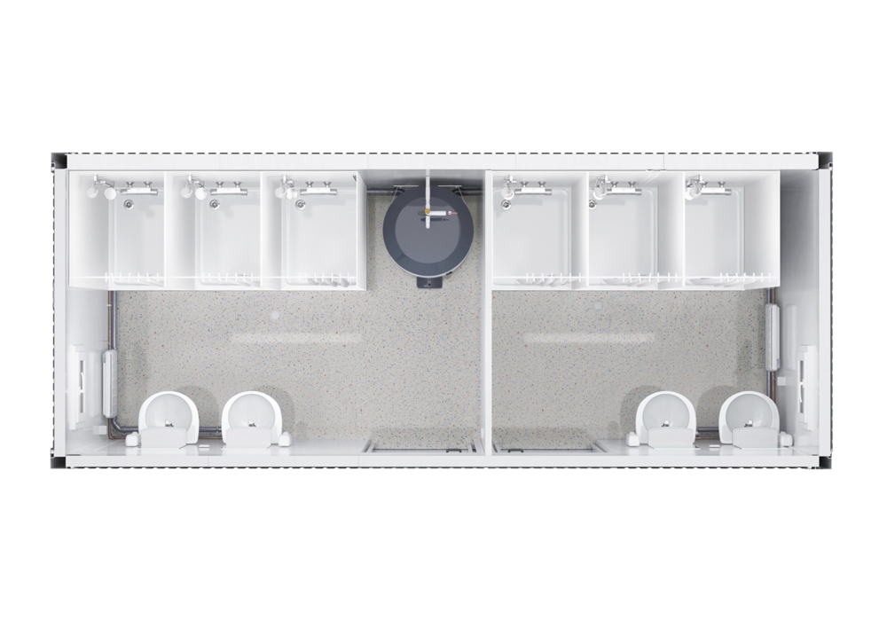 Os interiores funcionais destes módulos de 20 pés foram cuidadosamente adaptados às necessidades dos trabalhadores. Após o turno, os colaboradores podem trocar-se e tomar duche em privacidade. Cada duche está equipado com uma cortina de duche. Como toque final, as áreas feminina e masculina incluem dois lavatórios e um aquecedor.
