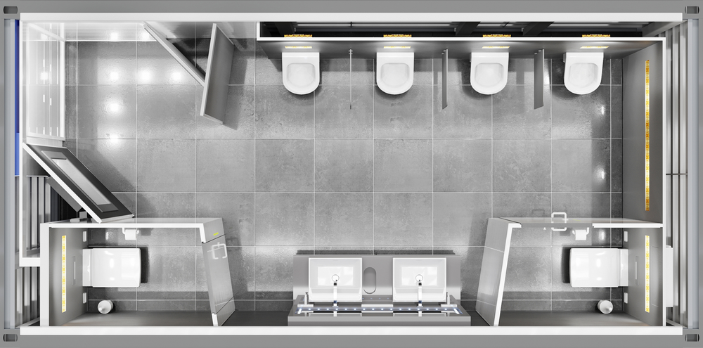 Uma das características especiais deste espaçoso contentor sanitário é o ecrã de 46 polegadas na área de entrada, onde podem ser exibidos, por exemplo, filmes com imagens da empresa. Cabines individuais fechadas à altura da divisão com o seu próprio sistema de exaustão de ar, um display de vago/ocupado com tecnologia LED, acessórios e urinóis sem contacto são outras comodidades contemporâneas.