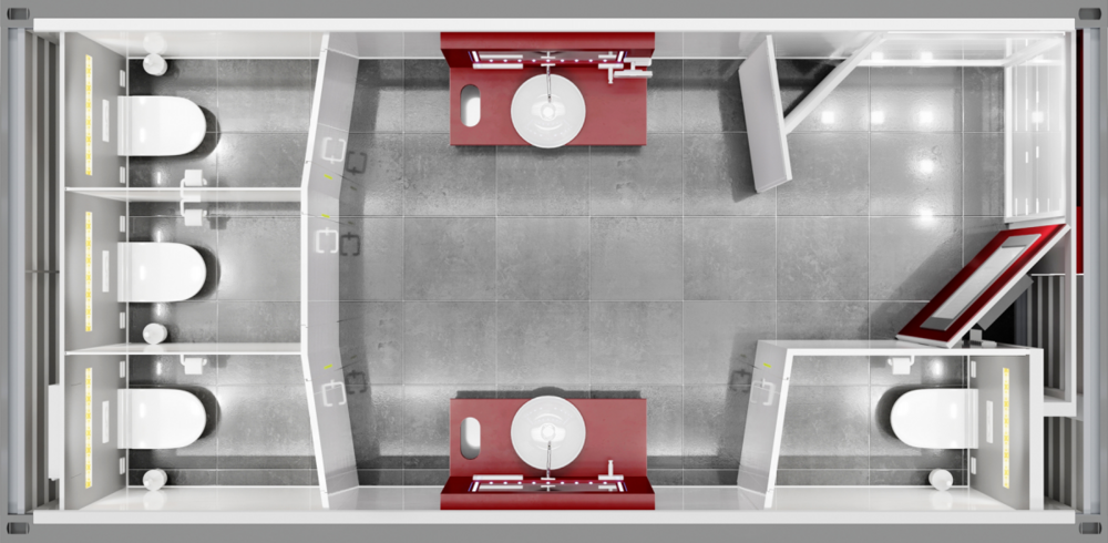 Um destaque especial é o grande espelho inclinado, que permite uma visão de corpo inteiro e, em combinação com o espelho de maquilhagem iluminado, não deixa nada a desejar. Os utilizadores das cabines individuais estão perfeitamente protegidos por paredes e portas à altura da divisão. A suave luz dourada especialmente desenvolvida para os contentores sanitários TOI TOI® Superior Line cria uma atmosfera única. A música de fundo discreta permite ao utilizador esquecer por um momento o que acontece ao seu redor.