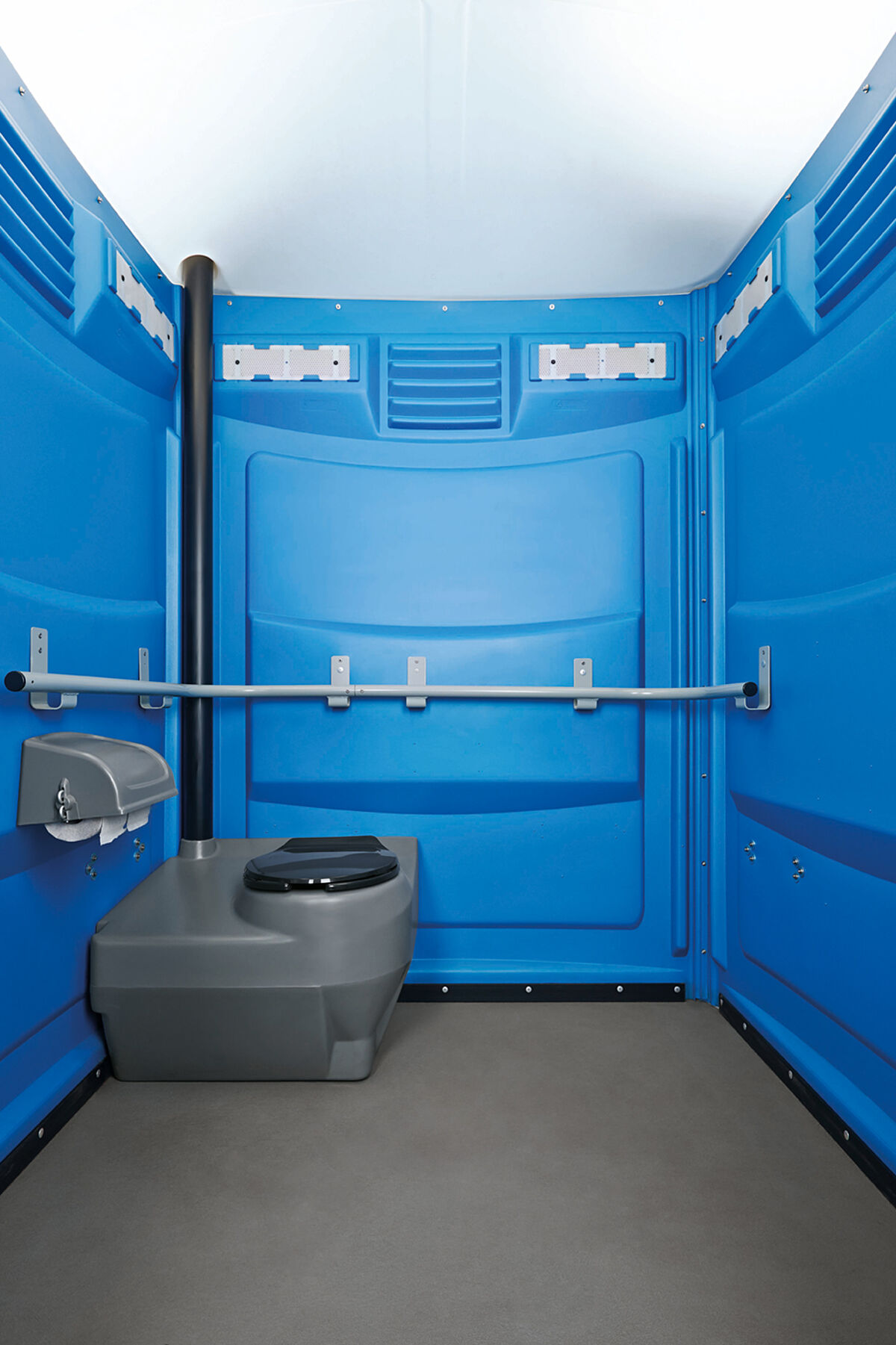 O TOI® PMR está equipado com o pacote completo de segurança TOI®. Inclui uma robusta barra de apoio que percorre três lados da cabine, piso antiderrapante e fecho automático da porta. Assim, pessoas com limitações de mobilidade podem utilizar o WC portátil com segurança, sozinhas ou acompanhadas.