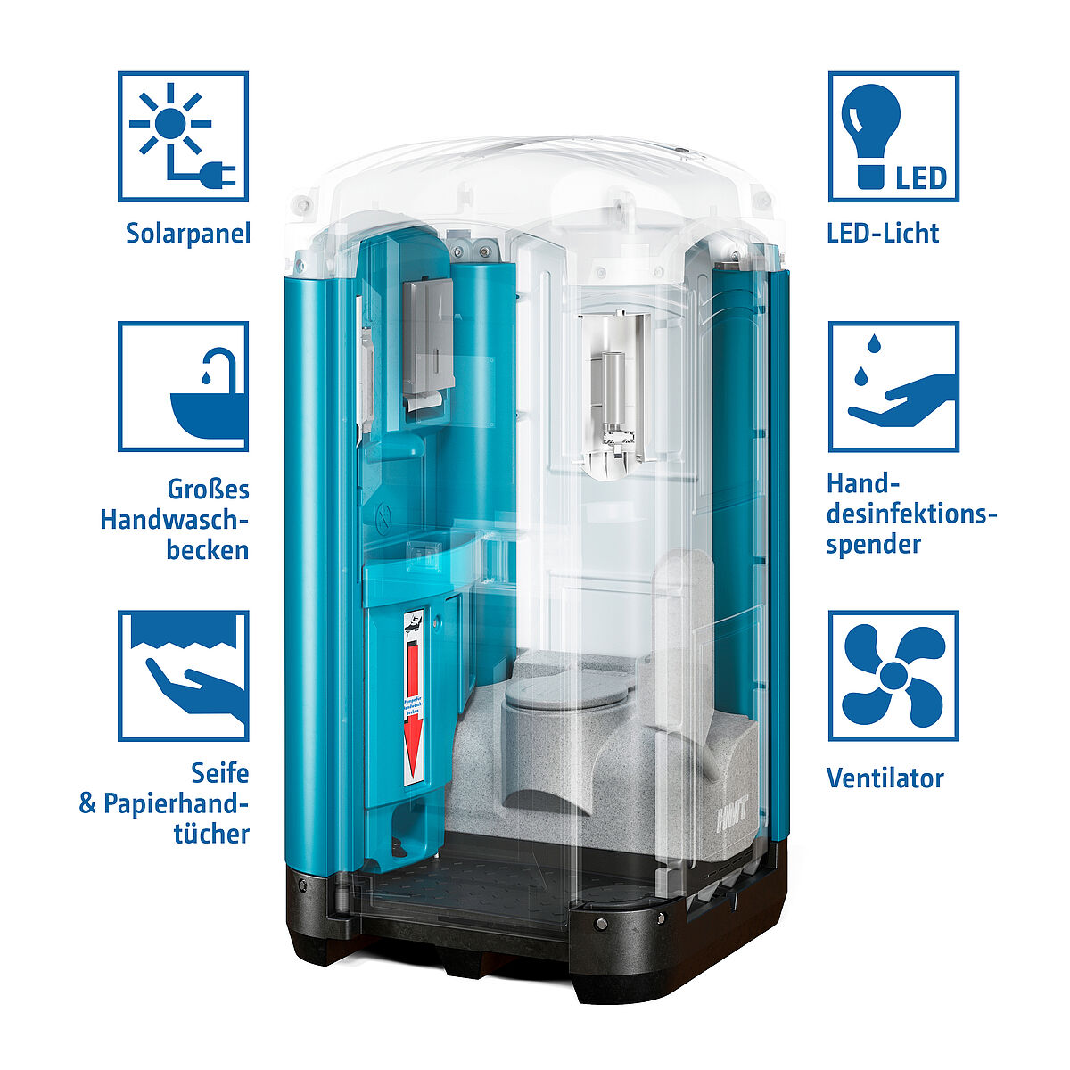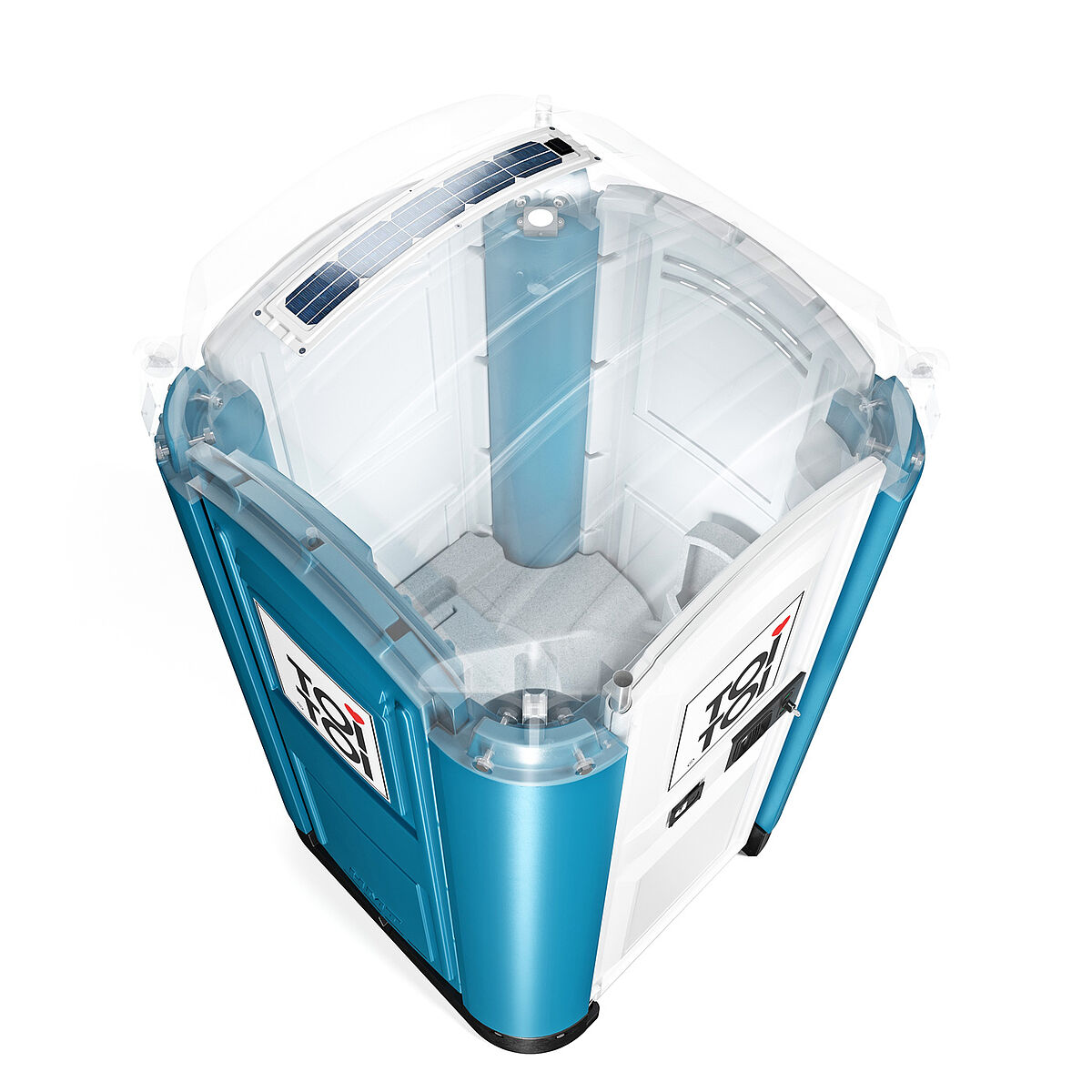 O conforto adicional proporcionado pela luz LED e pelo ventilador está integrado de forma otimizada na parede lateral e é alimentado por um painel solar. O ventilador ventila também o depósito de águas residuais fechado, reduzindo assim os odores. O pacote de higiene e conforto, a fabricação robusta, as cores claras e um design ergonómico e moderno fazem do TOI® WATER UP uma solução imprescindível e um novo padrão para obras e eventos.