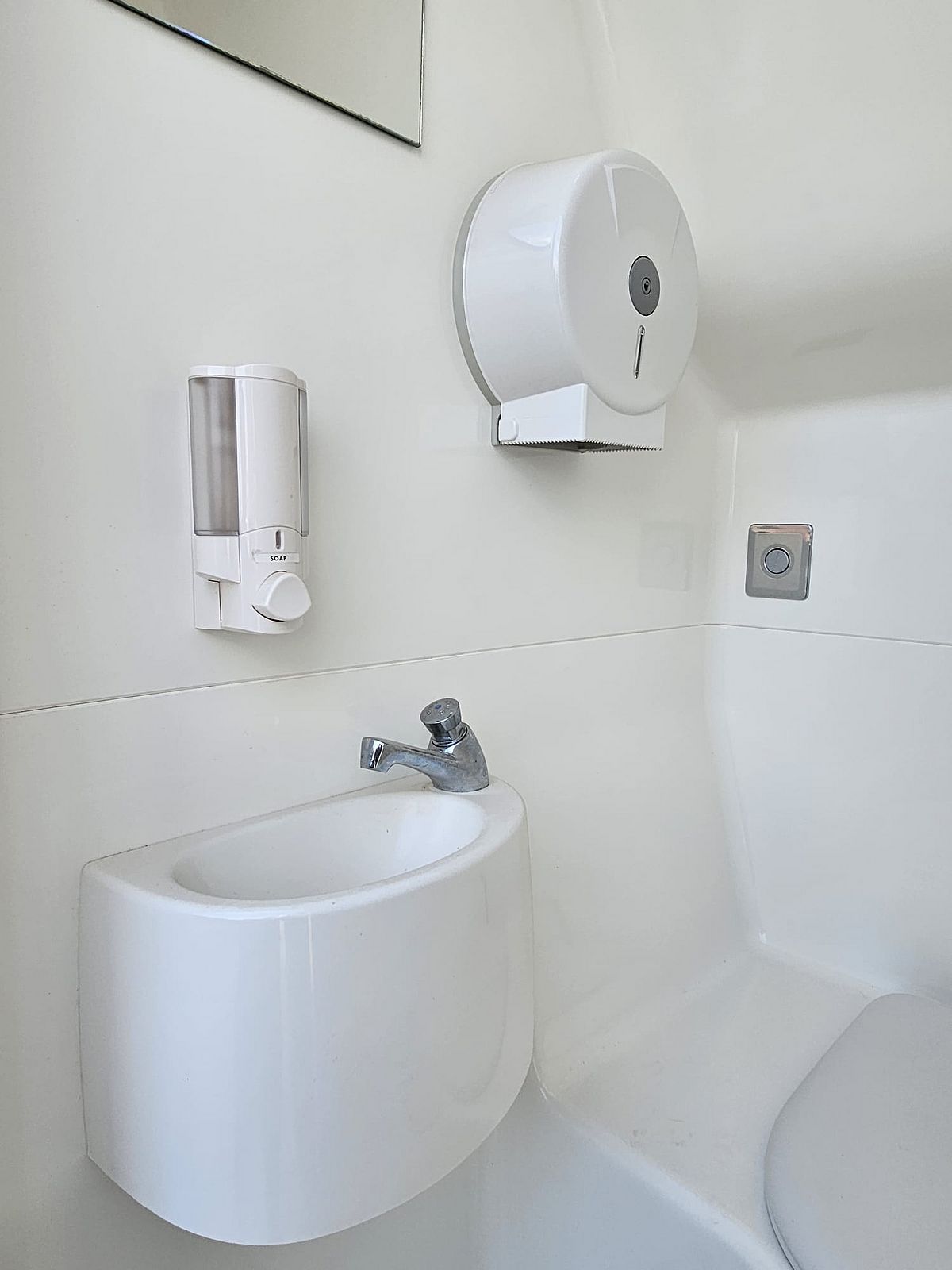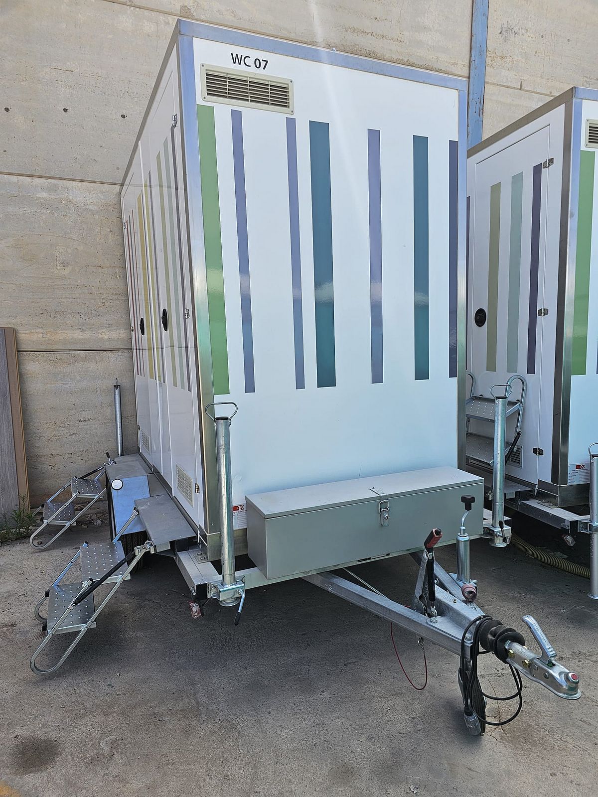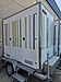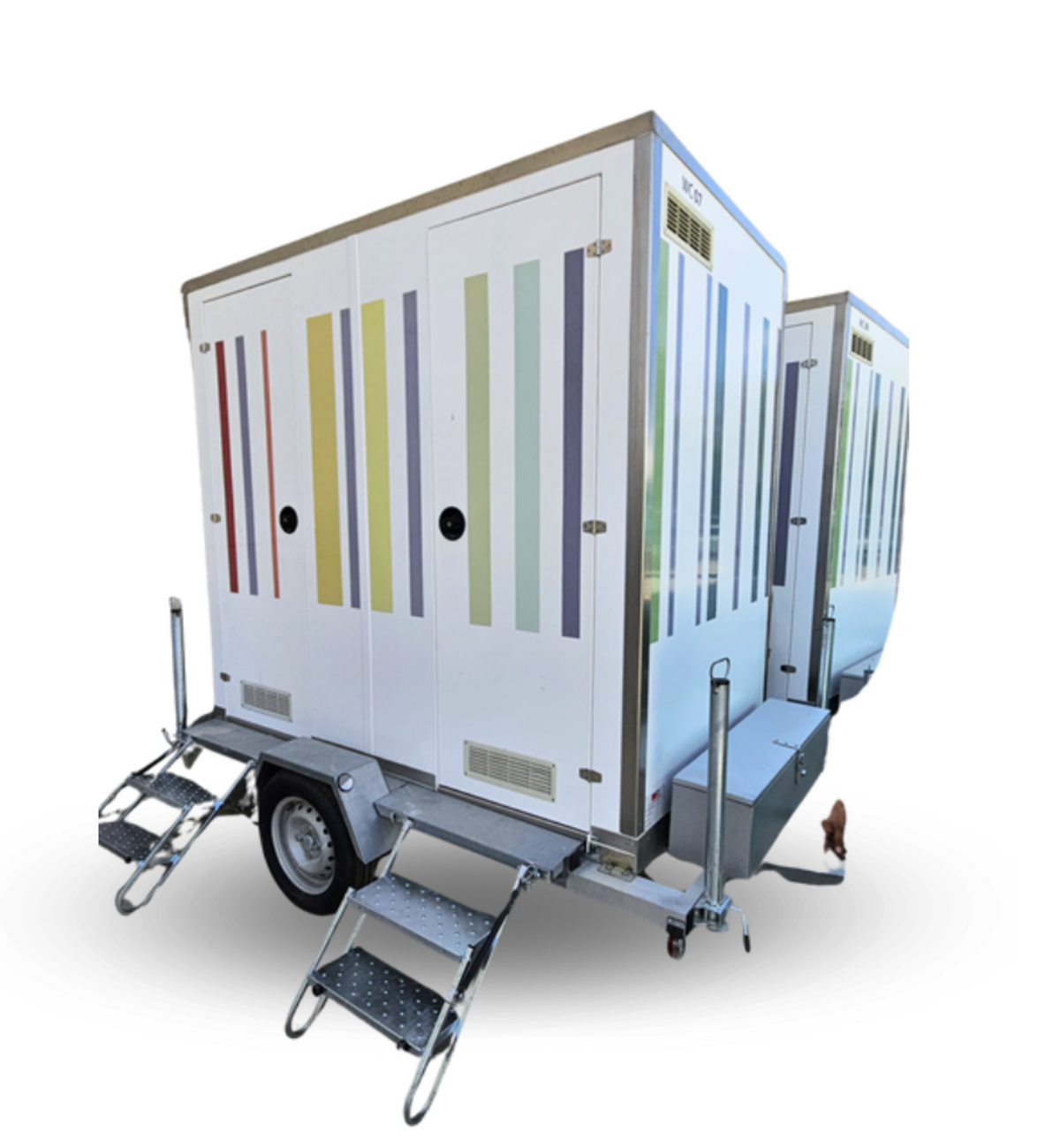 TOI® REBOQUE DUO MINI, um reboque sanitário autosuficiente, ambientalmente sustentável, fácil de transportar e instalar. Para maior privacidade, é composto por 2 cabines individuais equipadas com WC, lavatório, espelho, saboneteira, dispensador de papel e iluminação LED com sensor de presença, alimentada por bateria, pelo que não necessita de ligação elétrica externa.