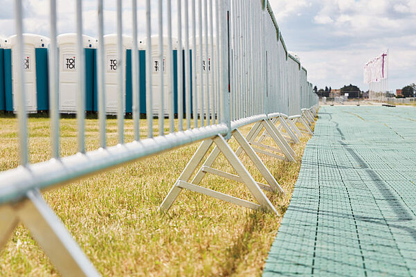 Os camiões só podem entrar no recinto do evento pelas rotas designadas? É necessário garantir a segurança do recinto? Sem problema para os nossos gestores de projeto. A TOI TOI fornece o equipamento adequado, como sistemas de orientação, portões de entrada e saída, rampas, barreiras, vedação com ecrãs de privacidade e placas para o chão, adequadas para o trânsito de cargas pesadas.